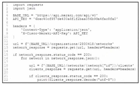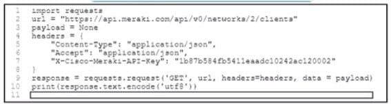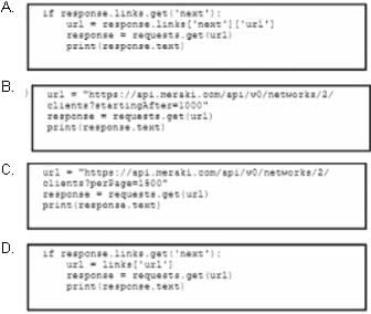 A Python script must list network clients in the Cisco Meraki API that have used a network with an ID of 2 The number of client entries per returned page is restricted to 1.000 according to the API specification Network 2 has 2.500 clients. What must be added where the code is missing to print the content of each response?