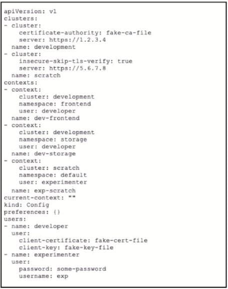 A kubeconfig file to manage access to clusters is provided. How many clusters are defined and which of them are accessed using username/password authentication versus certificate?