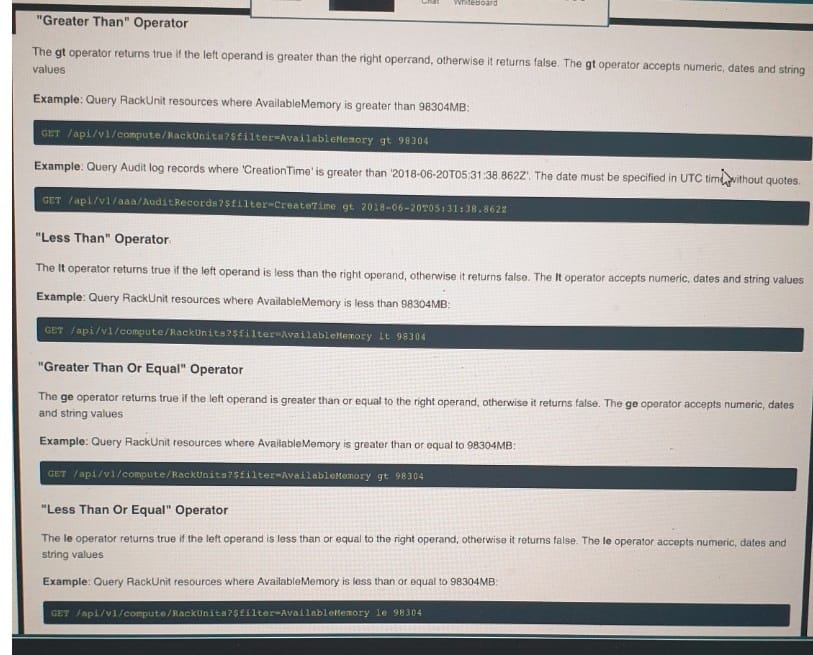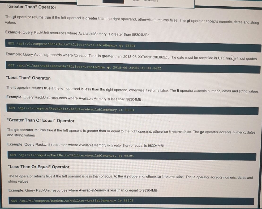 Click on the GET Resource button above to view resources that will help with this question. An engineer is managing a DC with 6000 Cisco UCS servers installed and running. The engineer has been asked to identify all resources where the model is in the UCSB family and the available memory is less than or equal to 5 GB. Which REST API call accomplishes this task?
