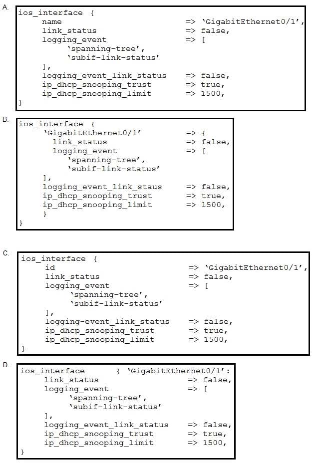 Which Puppet manifest needs to be used to configure an interface GigabitEthernet 0/1 on a Cisco IOS switch?