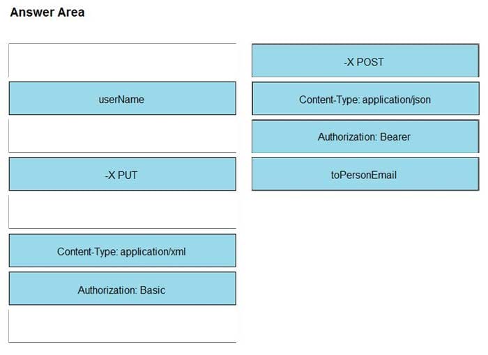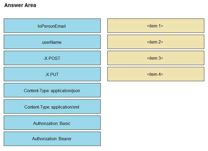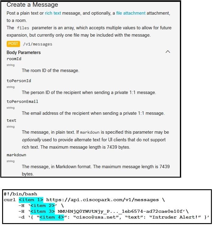 Refer to the exhibit. A system administrator has installed a Linux-based alarm system in their home that can execute a Bash shell script when an intruder is detected. Drag and drop the code snippets from the left onto the item numbers on the right that match the missing sections in the exhibit to create a chat-ops script that will notify of alarms via the Webex Teams REST API. Not all code snippets are used.