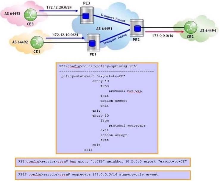 Based on the VPRN aggregate route configuration, which routes are advertised to CE2?