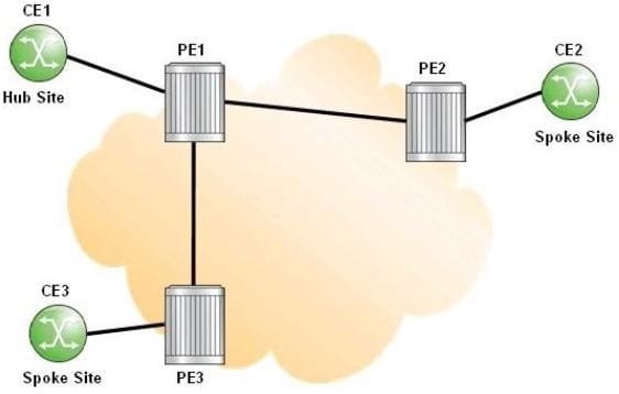 B. All traffic between spoke sites must pass through CE1.