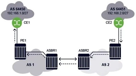 For the Inter-AS model A VPRN, which of the following is FALSE when CE2 sends an IP packet to 192.168.1.1?