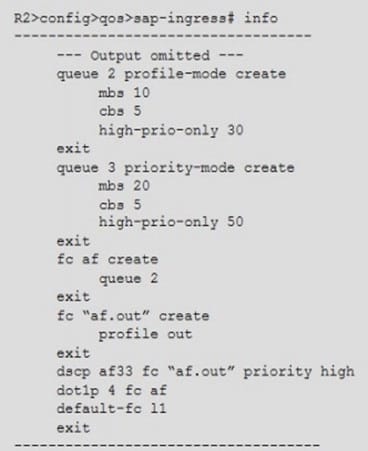 According to the SAP-ingress QoS policy shown, which packets have a higher priority to enter queue 2?