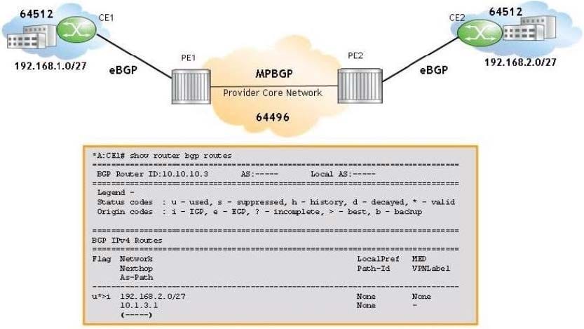 The CLI command "remove-private" is configured on PE1 to eliminate BGP loops in the VPRN. For the displayed route, what is the value of the AS-Path field?