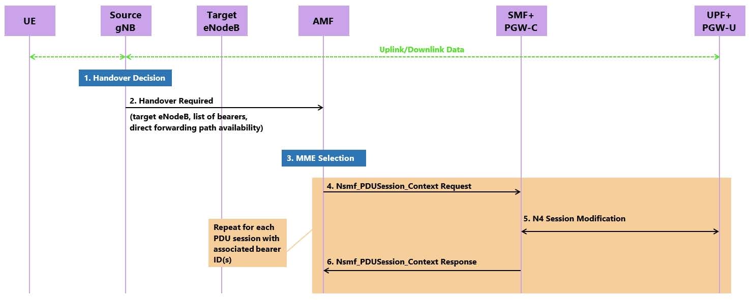 C. Source AMF sends a Forward Relocation Request message to the target MME and provides session management contexts.