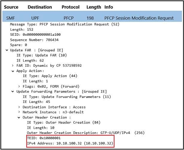 The exhibit below displays a packet capture of the PFCP Session Modification Request message sent during a PDU Session Establishments procedure. What do the highlighted TEID and IP Address refer to?