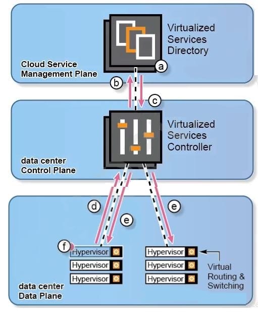 B. Step d, which refers to the VRS agent informing the VSC of the placement of a new VM, is triggered by step f in which the VM is instantiated on a hypervisor.