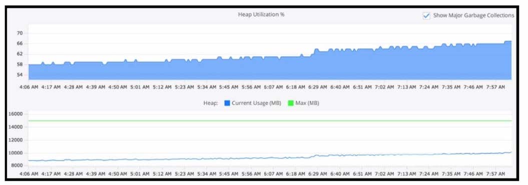 B. Refer to the Tiers and Nodes section and into the Memory tab and visualize Heap Utilization (%) and Heap Current Usage (MB) Vs Max (MB)
