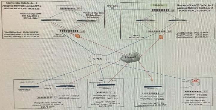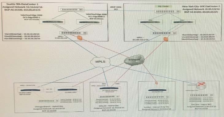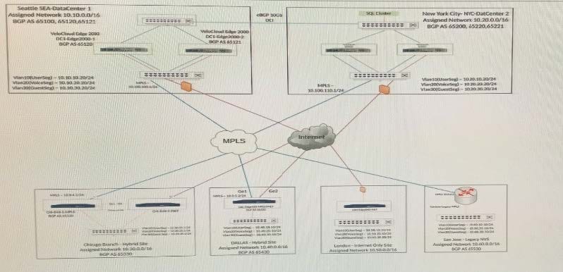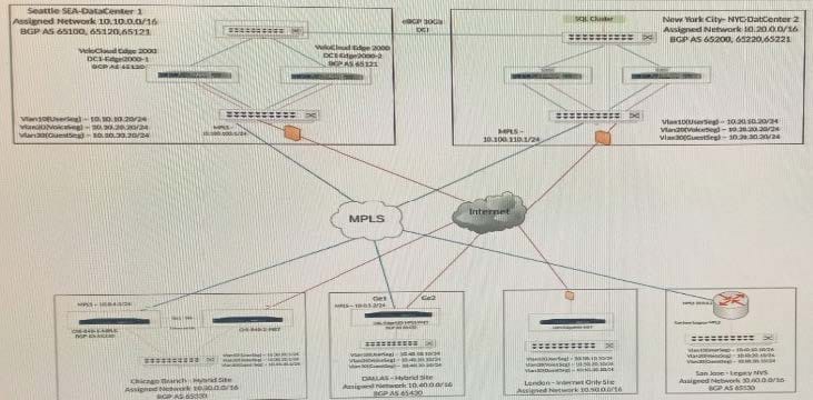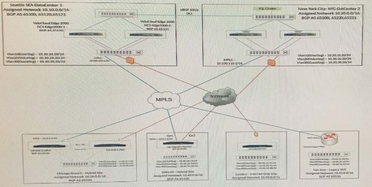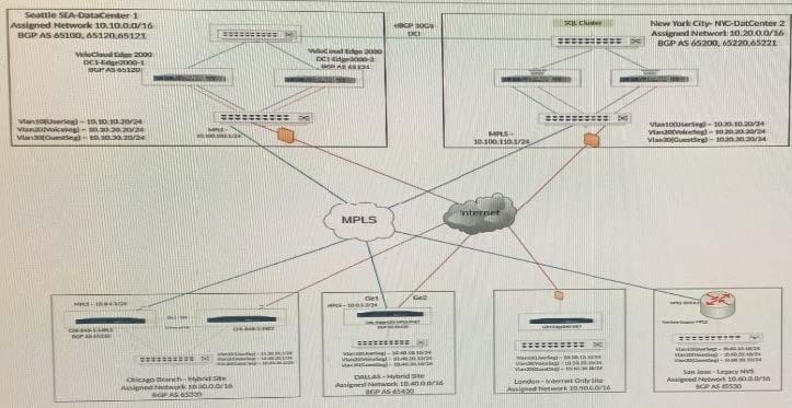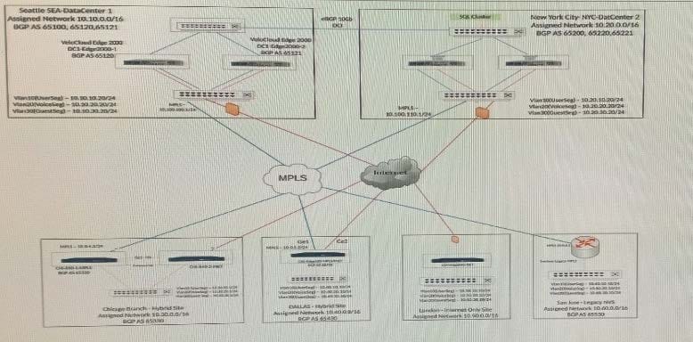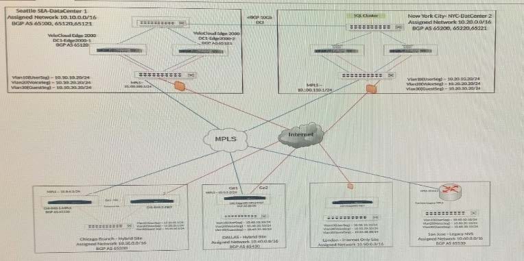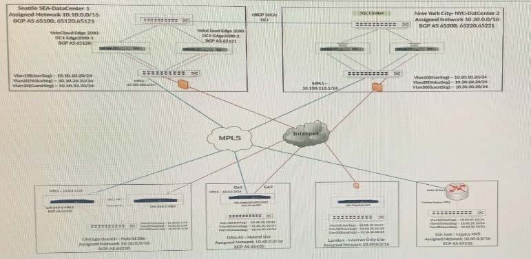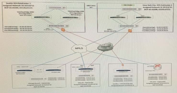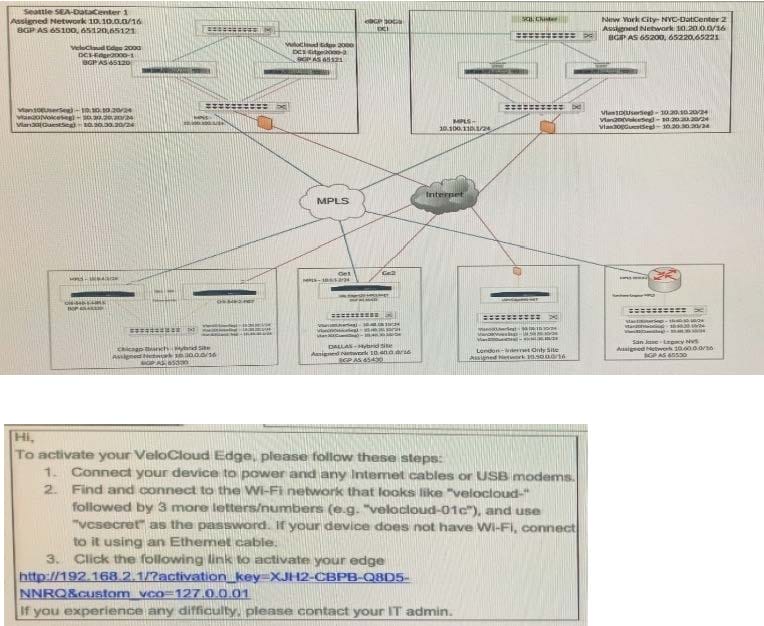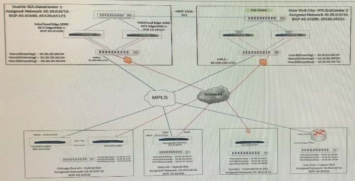A network administrator is tasked! with enabling SO-WAN at three branch locations. A topology has been provided for reference. For each site, the administrator is having issues bringing edges online, as another administrator has gone ahead and created a configuration ahead of time. The organization has several branch sites- One is an Internet- only site and two are Hybrid locations with both internet and MPLS: The last location is MPLS only. There are hub data center locations in this environment as well. Please refer to the topology.