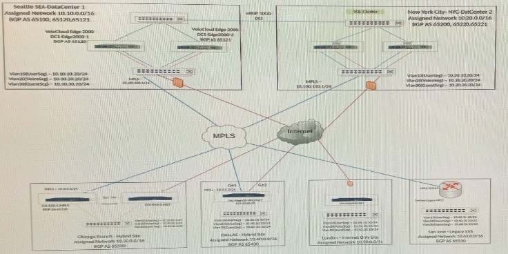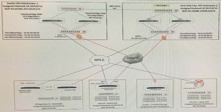 A network administrator is tasked with enabling SD-WAN at three branch locations, A topology has been provided for reference. For each site, the administrator is having issues bringing edges online, as another administrator has gone ahead and created a configuration ahead of time. The organization has several branch sites. One is an Internet- only site and two are Hybrid locations with both internet and MPLS. The last location is MPLS only. There are hub data center in this environment as well. Please refer to the topology.