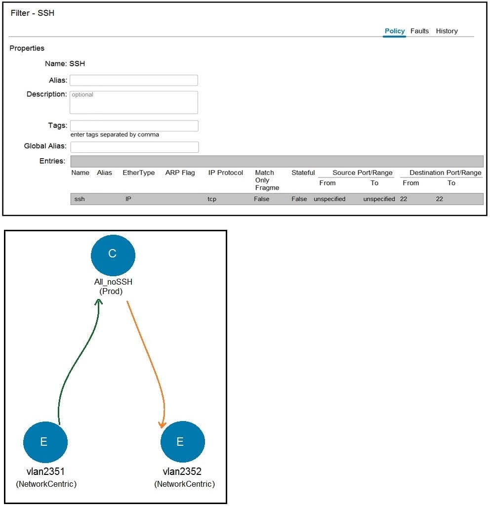 Refer to the exhibits. Which subject must be configured for the All_noSSH contract to allow all IP traffic except SSH between the two EPGs?