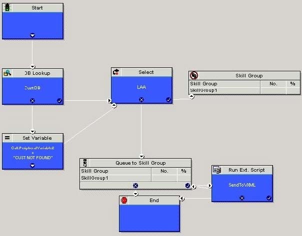 The Cisco Unified ICM call routing script can access an external database for routing or CTI data. In this script, the DB Lookup node is used to access a CustDB to look up the customer by the caller entered digits associated with the call.