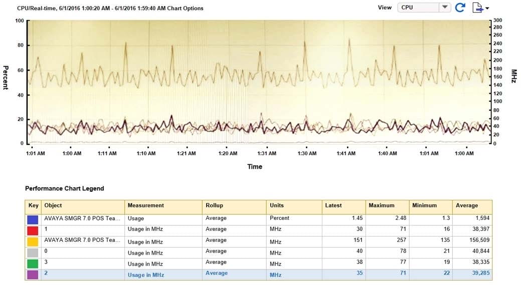 Why is the usage measurement of CPU2 (in Purple) shown in the chart highlighted in the table?
