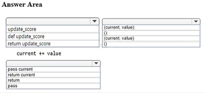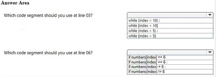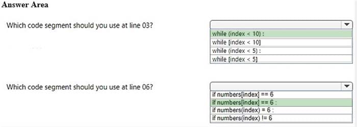 How should you complete the code? To answer, select the appropriate code segments in the answer area.