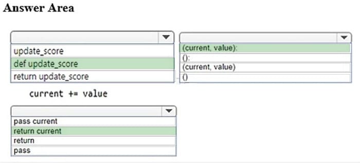 You need to create a function that meets the following criteria: The function is named update_score The function receives the current score and a value The function adds the value to the current score The function returns the new score