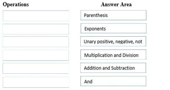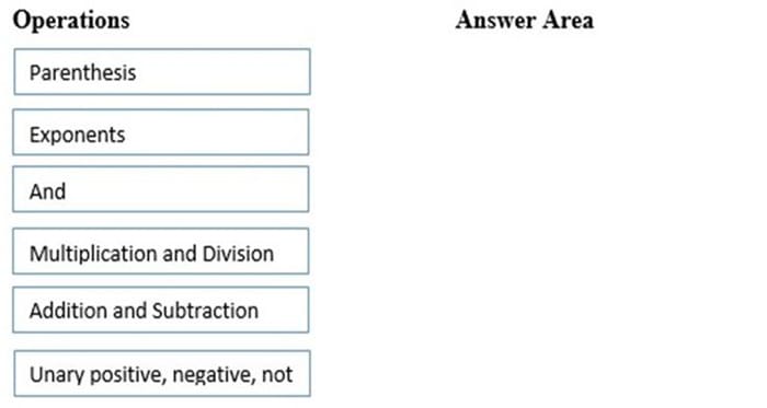 What is the correct order of operations for the six classes of operations ordered from first to last in order of precedence? To answer, move all operations from the list of operations to the answer area and arrange them in the correct order.