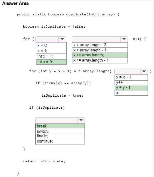 Return false if all values in the array are unique How should you complete the code? To answer, select the appropriate code segments in the answer area. NOTE: Each correct selection is worth one point.