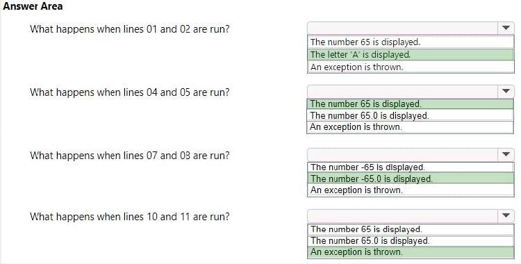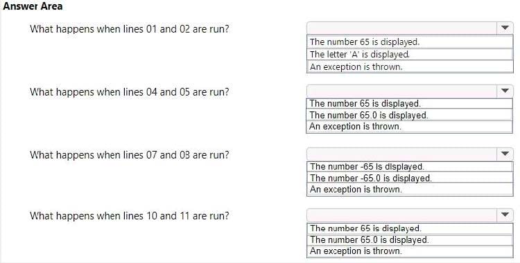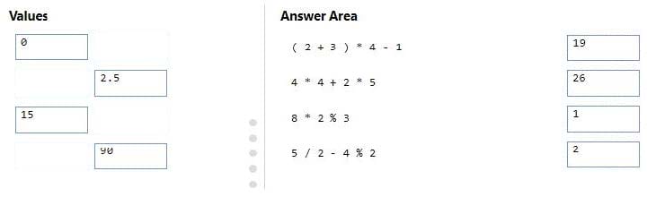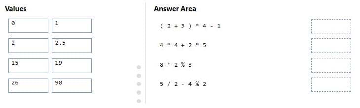 What is the value of each code segment? To answer, drag the appropriate value from the column on the left to its code segment on the right. Each data may be used once, more than once, or not at all. You may need to drag the split bar between panes or scroll to view content.