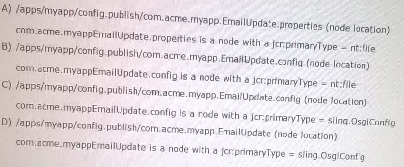 You have written an OSGi service with the class name com.acme.myapp.EmailUpdate, You only we this service to run on the publish instance. Which two configurations would run the service on the publish instance only? (Choose two).