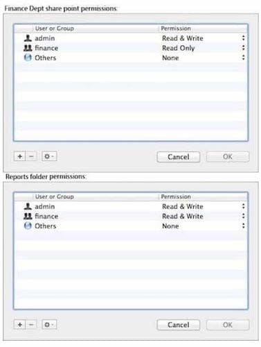 On an OS X Mavericks computer with OS X Server installed, you have created a share point named "Finance Dept." that contains a folder named "Reports." The permissions for both are shown below.