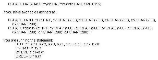 If each table (T1 and T2) has 50,000 rows, which of the following commands will ensure that the temporary table created by the select statement will fit entirely in the buffer pool, assuming that there is a primary key/ foreign key relationship between column C1 in table T1, and column C1 in table T2?