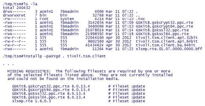 An administrator attempts to install the fileset tivoli.tsm.client, but it fails due to missing requisites.