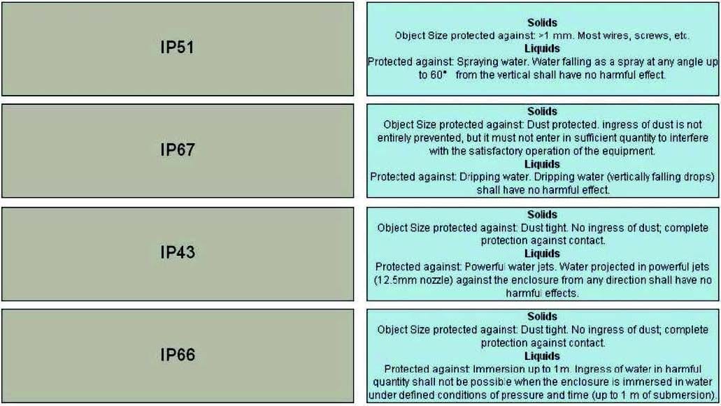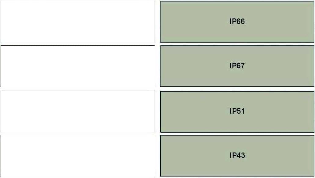 Match the following descriptions to their proper IP rating below. Drag each gray box from the left column to the matching blue box in the right column.