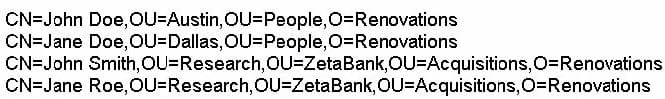 Renovations Inc. has acquired a new division from ZetaBank and merged them into their LDAP directory so they can access IBM Sametime Instant Messaging. The LDAP administrator has sent this excerpt of the directory to the Sametime administrator to acknowledge the merge has been performed: