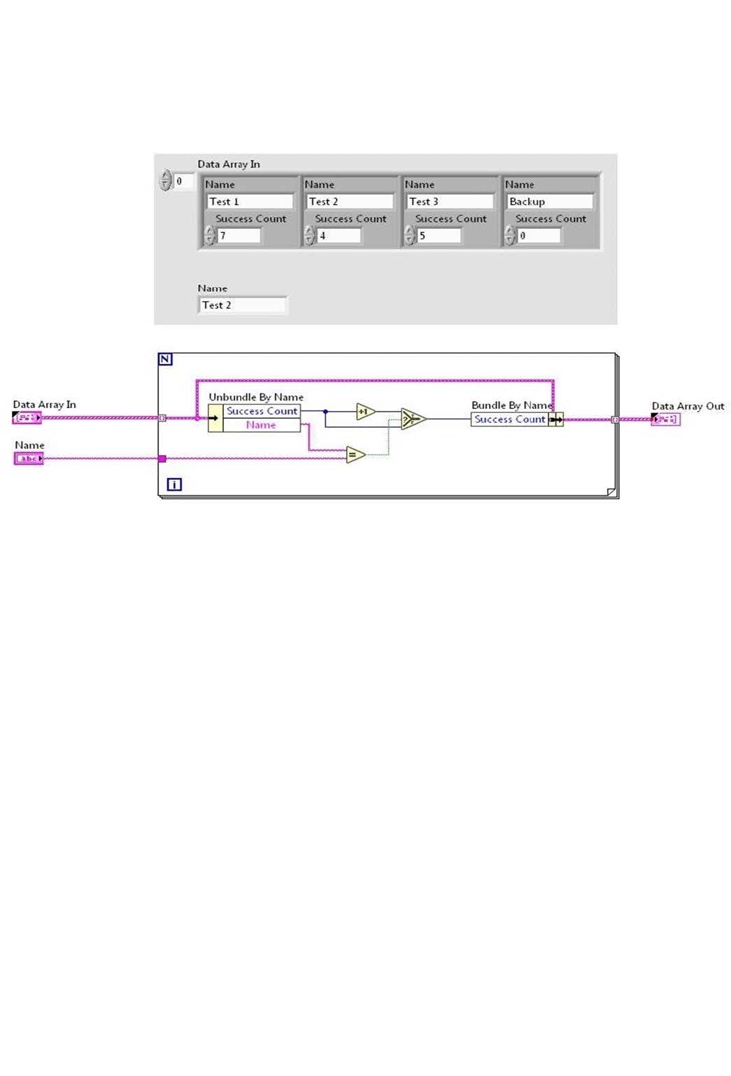 What will be displayed in Data Array Out after the VI runs with Data Array In and name input as shown?