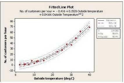 B. The relationship between outside temperature and number of customers per hour is a Linear Regression