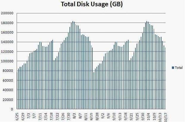 On 8/15, what causes the drop in disk usage on the EMC Data Domain system as illustrated in the exhibit?