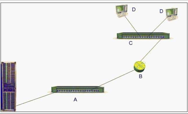 C. A=Switch B=Router C=Switch D=Hosts