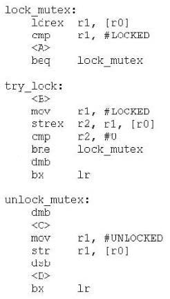 The following pair of functions implement a simple mutex spinlock which might be used to protect a critical code section in a multi-threaded application. The address of the lock variable is in r0.