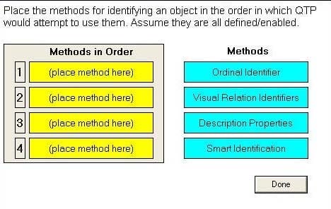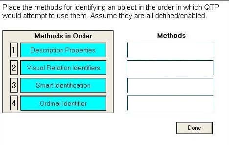 Click the Task button. Place the methods for identifying an object in the order in which QTP would attempt to use them Assume they are all defined/enabled.