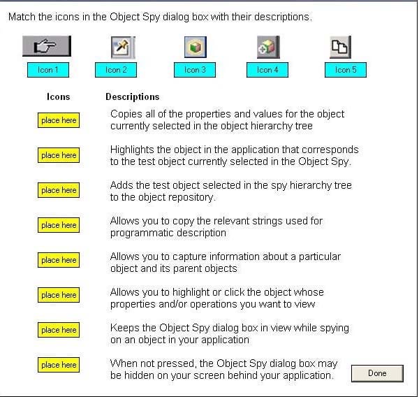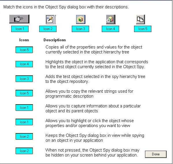 Click the Task button. Match the icons in the Object Spy dialog box with their descriptions. Note: Icons may be used more than once.