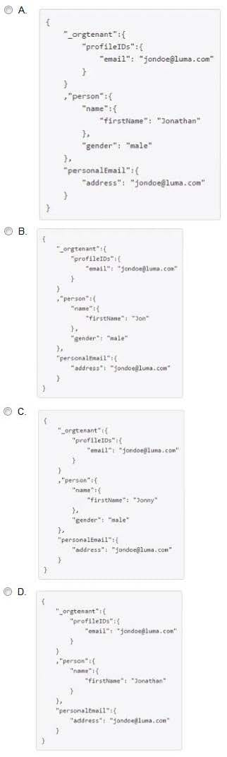 To evaluate the final result, the QA engineer uses the Merge Profile configuration shown; The primary identity used is '.orgtenant.profilelDs.email". What data should appear m the user profile?