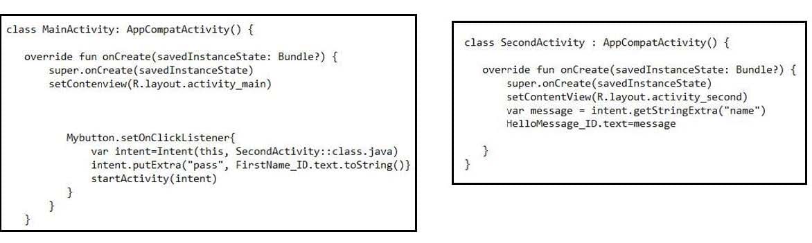 want to pass data in text field (ID: FirstNameJD) of MainAcitivity to SecondActivity. The passed data will appear in SecondActivity inside a TextView widget with Id: HelloMessageJD. You will use Intent to pass this data from MainActivity to SecondActivity. The Following two images include the Android code which will be written in MainActivity.kt and SecondActivity.kt files. Your data will not pass from MainActivity to SecondActivity due to a mistake in the code in SecodActivity.kt. Which of the following choices is a correct solution to make this app run correctly?