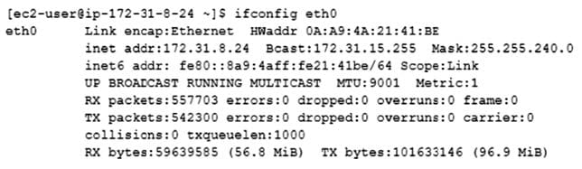 A Network Engineer is troubleshooting a network connectivity issue for an instance within a public subnet that cannot connect to the internet. The first step the Engineer takes is to SSH to the instance via a local bastion within the VPC and runs an ifconfigcommand to inspect the IP addresses configured on the instance. The output is as follows: