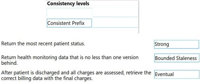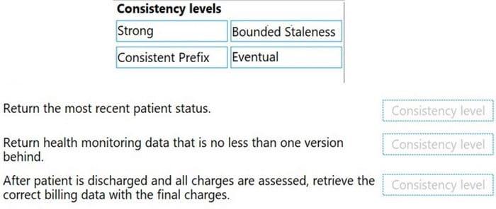Which consistency levels should you implement? To answer, drag the appropriate consistency levels to the correct requirements. Each consistency level may be used once, more than once, or not at all. You may need to drag the split bar