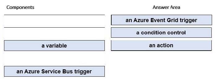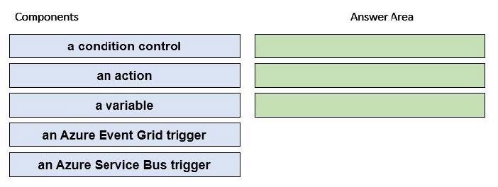 Which three components should you create next in the Logic Apps Designer? To answer, move the appropriate components from the list of components to the answer area and arrange them in the correct order.