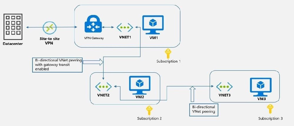 Hub1 connects to an on-premises network by using a Site-to-Site VPN connection.