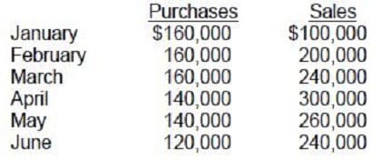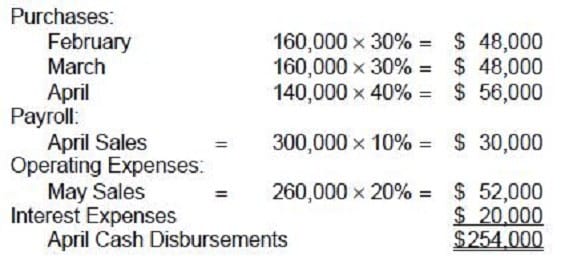 Forty percent of purchases are paid for in cash at the time of purchase, and 30 percent is paid for in each of the next two months. Purchases for the previous November and December were $150,000 per month. Payroll is 10 percent of sales in the month it occurs, and operating expenses are 20 percent of the following months sales (July sales were $220,000). Interest payments were $20,000 paid quarterly in January and April. Brandon's cash disbursements for the month of April were: