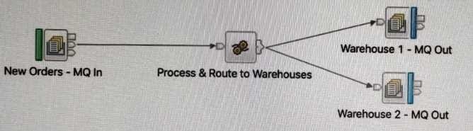 The following flow receives order messages on an MQInput node then uses a Compute node to do some processing and sends MQ messages to two warehouses on two different queues.