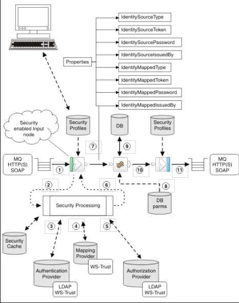 The following diagram shows an example message flow and gives an overview of the sequence of events that occur when an input message is received by a security enabled input node in the message flow. Select the number that would
