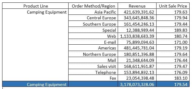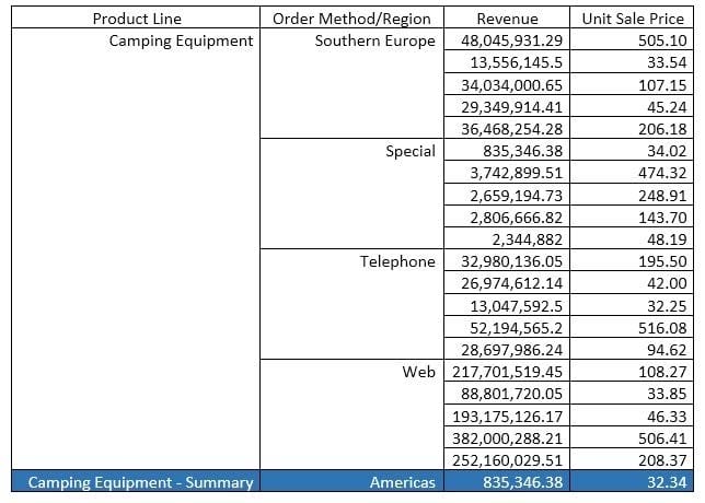 A report author has applied a Union set operation on two queries with the resultant query named Main_Query containing the data items: Product line, Order method/Region, Revenue and Unit Sale Price. The report author added the data items to the list, grouped on Product line and Order method/Region. The screenshot below shows the result: