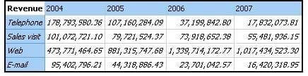 In a crosstab, Campaign is in the rows area, Order method type is in the columns area, and Quantity is the measure. Campaign and Order method type are specified in the query. The report runs, displaying quantity valuesfor all years.