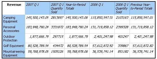 Consumers want a report to compare the revenue and quantity sold for all product lines in a selected quarter, to the same quarter for the previousyear. They also want to see the total for periods, up to and including the quarter selected.