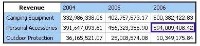 Based on the crosstab displayed, the report author creates a singleton using the tuple function as follows: tuple([Camping Equipment],[Revenue],[2006]).